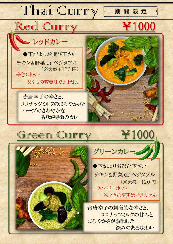 2026.02.02 桑名サンシパーク店限定!タイカレーが初登場! 期間限定メニュー!ぜひお試しくださいね! タイカレーが初登場!レッドカレー・グリーンカレーあなたはどっち? 単品もご用意してます♪ テイクアウトもできます! テイクアウト グリーンカレー テイクアウト レッドカレー Post Share LINE note 桑名店・四日市店限定!スパイスチキンカレーランチ/セット、テイクアウ...